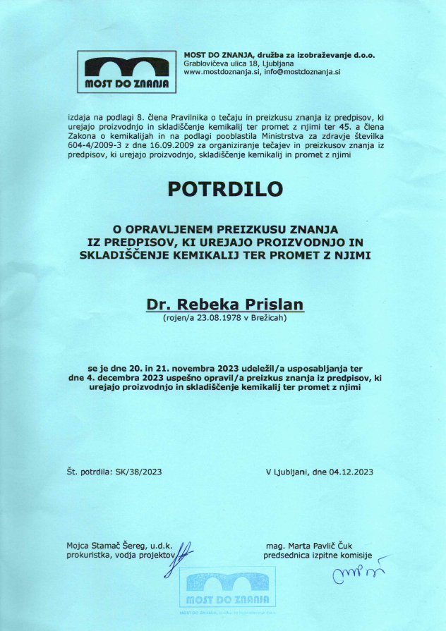 Moja strast do kemije me je popeljala skozi doktorski študij analizne kemije in nato v 17-letno kariero v farmacevtskem podjetju, kjer sem se ukvarjala z razvojem in raziskavami zdravil. Spomnim se dne, ko sem v drogeriji kupovala mazilo za otroka in preverjala sestavine. Takrat se je v meni nekaj spremenilo. Svojega otroka nisem želela mazati z mazilom, ki vsebuje naftne derivate. In tako sem vstopila v svet preučevanja naravnih kozmetičnih surovin, načinov priprave kozmetičnih izdelkov in v branje kozmetičnih uredb. Mogočnost in širina kozmetologije me je prevzela in mi odprla novo pot. Prvi kozmetični izdelki so bili izdelani za družinsko rabo, a so kmalu dobili razrežnosti tudi širše uporabe. Poznavanje sestave kože, prehajanja učinkovin in izbor sestavin za različne tipe kože v meni prebuja strast do razvoja novih, kakovostnih in varnih kozmetičnih izdelkov.